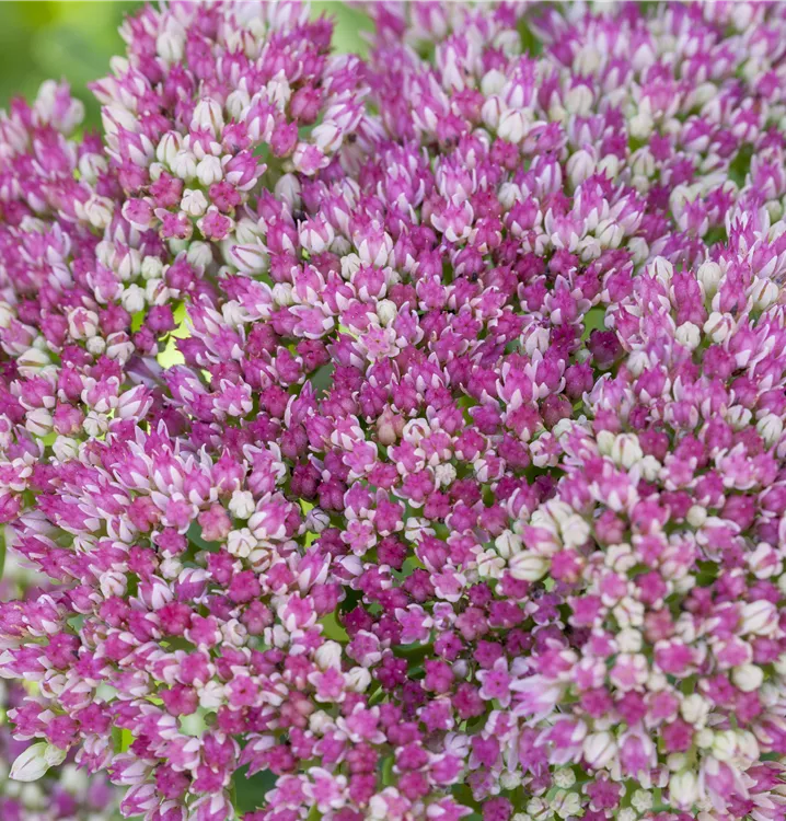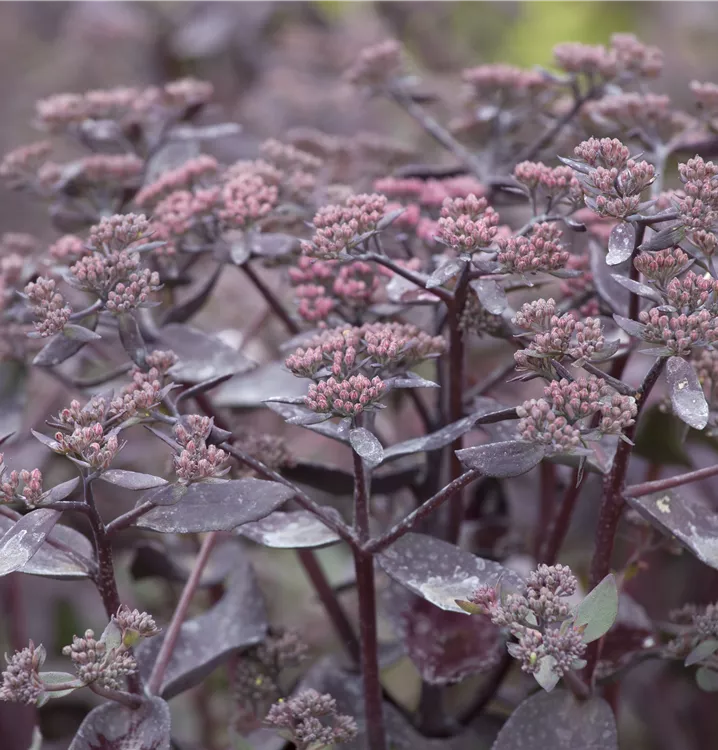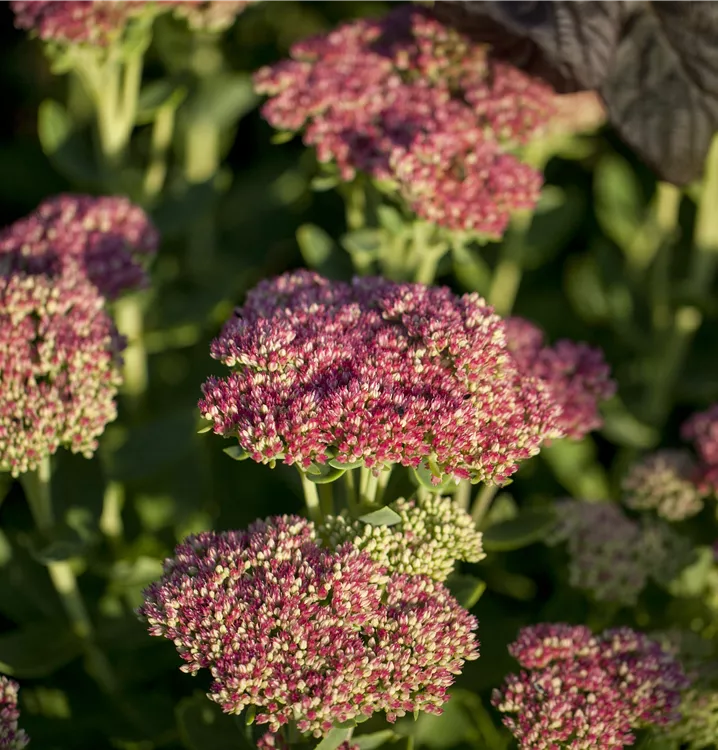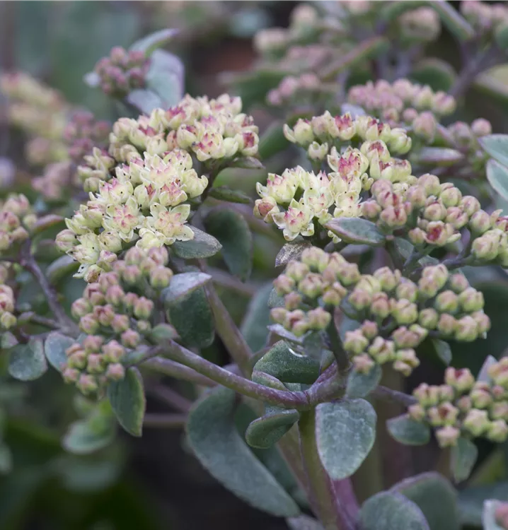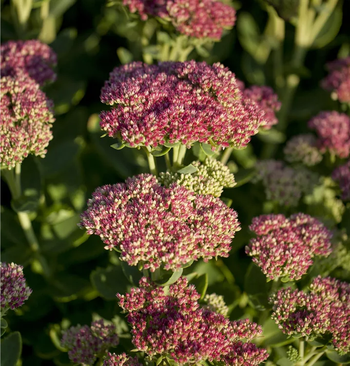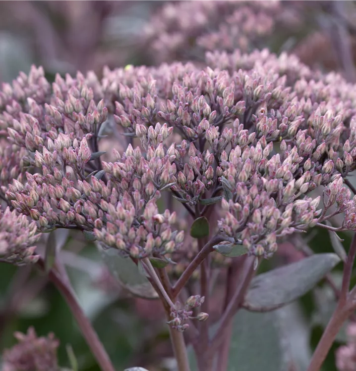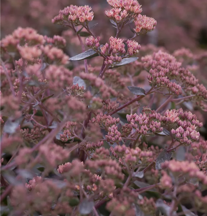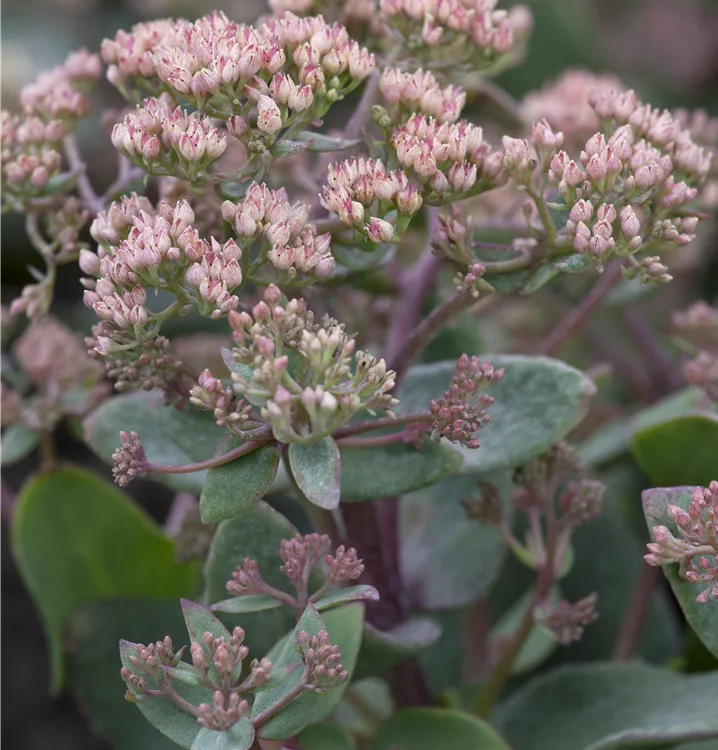 Sedum telephium bildet in Dolden angeordnete, rosafarbene Blüten ab August.