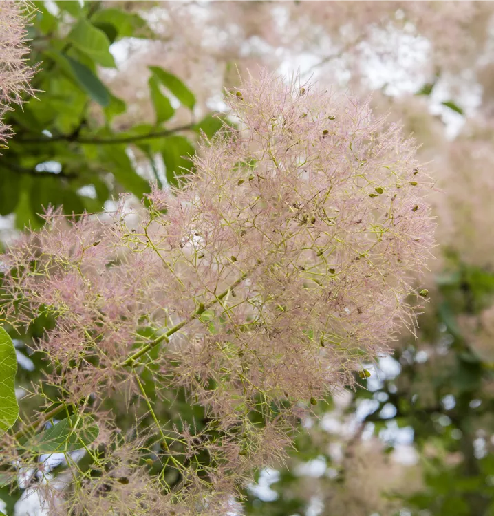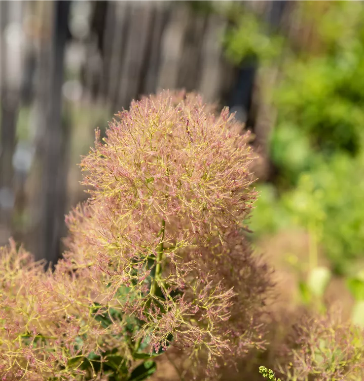 Besonders dekorativ sind die hellbraunen Früchte von Cotinus coggygria. Diese erscheinen ab August.