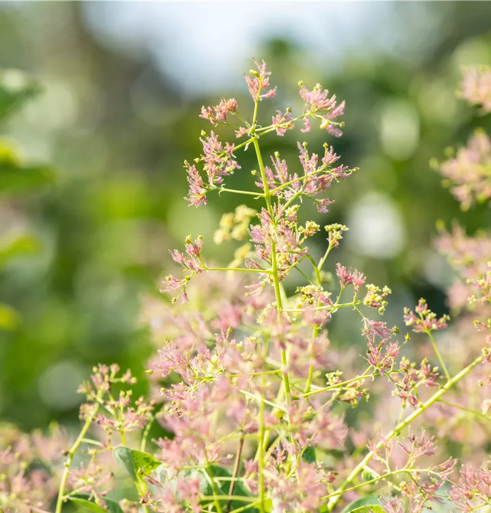 Die grüngelben Blüten des Perückenstrauch erscheinen in Rispen von Juni bis Juli. Diese werden etwa 15 - 20 cm groß.