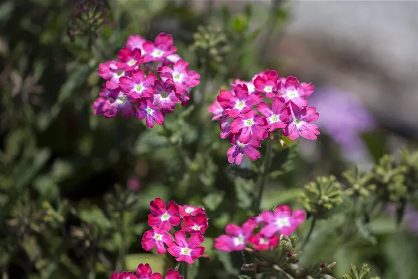 Verbena Die Verbene gehört zur Familie der Eisenkrautgewächse und ist in den eher sonnigen Gebieten der Welt beheimatet. Das Eisenkraut wächst im Süden Brasiliens, in Sudamerika und Argentinien. Die sonnenliebenden Pflanzen kommen aber mittlerweile auch gut mit den Wetterbedingungen in unseren heimischen Gärten zurecht. Verbenen sind nicht besonders anspruchsvoll und brauchen lediglich einen sonnigen und warmen Standort. Und selbst sommerliche Hitze hält die Pflanze sehr gut aus. Die neueren Züchtungen sind sogar resistent gegen Wind und Wetter.