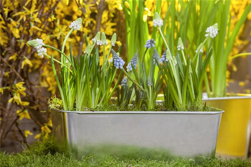 Muscari Sonnenschein und blauer Himmel, wenn man aus der Balkontür tritt? Keine rutschigen Stellen, kein Matsch? Ja, es wird Frühling auf dem Balkon! Kästen, Töpfe und Ampeln warten auf pflanzlichen Inhalt. Vor den Eisheiligen konzentriert man sich auf frostharte Pflanzen. Trotzdem deckt man die botanischen Lieblinge im Zweifelsfall lieber ab. Der Frühling auf dem Balkon beginnt mit einer geschickten Etagen-Konstruktion. Zuunterst im Pflanzgefäß warten die Zwiebeln von Traubenhyazinthen aufs Gedeihen, gern begleitet von gelben Narzissen. Im nächsten Stockwerk folgen Tulpen, und im letzten die zauberhaften Schneeglöckchen. Wer es bunt mag, ergänzt sie mit farbigen Krokussen.