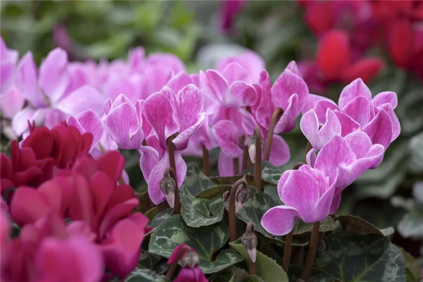 Cyclamen persicum Am bekanntesten sind die Alpenveilchen als Topfpflanze für die Wohnung. Hier blühen sie in vielen Farben und erfreuen auch in der kalten Jahreszeit ihren Besitzer. Doch auch nach draußen dürfen sie gepflanzt werden – jedoch sind die üblichen Hybriden nicht winterhart und daher nur im Sommer für den Garten geeignet. Allerdings gibt es besondere Arten, die selbst harte Fröste überdauern. Dazu zählt beispielsweise das Anatolien-Alpenveilchen. Wer diese Kulturart bevorzugt, sollte möglichst kleine Knollen aus Kulturbetrieben kaufen und am Standort nicht den Boden aufhacken. So bilden die Alpenveilchen nach einer Weile dicke Teppiche mit herrlichen Blüten.