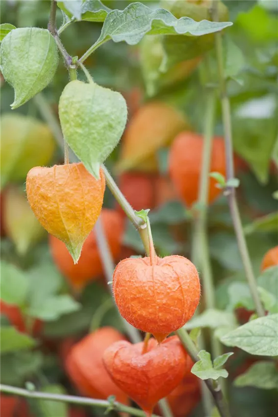 Physalis alkekengi var. franchetii Die Lampionblume hat herzförmige Kelchblätter, die ihr den Namen gegeben haben. Denn die Blätter sehen aus wie kleine Lampions. Mit ihrer leuchtend orange-roten Farbe bringt die Pflanze ordentlich Farbe ins Blumenbeet. Wer also Lampion-Lichterketten im Garten liebt, ist mit der Pflanze auf jeden Fall auf der richtigen Seite. Und: sie verbraucht keinen Strom! Genau das richtige also, wenn man seinen Garten ökologisch nachhaltig schmücken will. Und die Lampions sehen auch verblüht noch sehr schön aus.