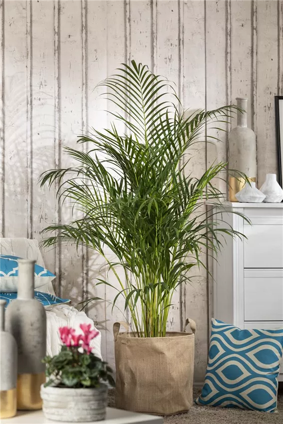 Chrysalidocarpus lutescens Die Dattelpalme ( Phoenix canariensis, P. dactylifera ) braucht im Gegensatz zu vielen anderen Arten nicht nur einen hellen, sondern einen richtig sonnigen Standort. Dankbar ist sie für enthärtetes Gießwasser. Die dritte Art, P. roebelenii , bevorzugt es hingegen schattig. Die Betelpalme ( Areca catechu ) präsentiert breite, dunkelgrüne, v-förmige Blätter und schätzt einen halbschattigen Standort und hohe Luftfeuchtigkeit; mehrmals wöchentlich besprühen bzw. die Luftfeuchte durch einen Raumluftbefeuchter erhöhen. Die Goldfrucht- oder Arecapalme ( Chrysalidocarpus ) zählt mit ihren langen, kammartig gefiederten Wedeln zu den beliebtesten Zimmerpalmen; sie wächst sehr schnell und sollte hell bis halbschattig stehen; bei direkter Sonneneinstrahlung verfärben sich die Blätter gelb.
