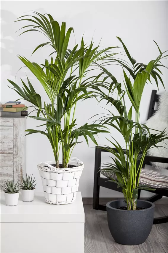 Howea forsteriana Wenn der Frühling noch nicht in Sicht ist und auch keine Fernreise auf dem Programm steht, wird unsere Sehnsucht nach exotischen Gefilden besonders groß. Dann hilft nur eins: Holen Sie sich die Tropen in Ihre vier Wände! Palmen bilden eine besonders attraktive „Untergruppe“ der Zimmerbäume. Viele Arten erreichen beeindruckende Wuchshöhen von zwei Metern oder mehr. So zählt die Bergpalme ( Chamaedorea elegans ) zu den besonders schnell wachsenden Vertretern ihrer Familie. Diese Zierpalme besitzt grazile, gefiederte Wedel und ist ausgesprochen pflegeleicht. Sie bevorzugt halbschattige bis schattige Standorte – keine direkte Sonneneinstrahlung! Gelegentliches Besprühen beugt braunen Blattspitzen vor. Die Kentiapalme ( Howea forsteriana ) besticht durch elegante, filigrane Wedel in dunklem Grün; sie kommt mit relativ wenig Licht und trockener Luft gut zurecht, was sie zur Ausnahmeerscheinung unter dem Palmen macht und auch für dunklere Raumecken prädestiniert. Zugluft und direkte Sonne meiden! Die Fischschwanzpalme ( Caryota mitis ) besitzt wie abgerissen aussehende Blätter, die ihr eine aparte Anmutung geben. Sie braucht einen hellen Standort und muss immer leicht feucht gehalten werden – Staunässe jedoch unbedingt vermeiden.