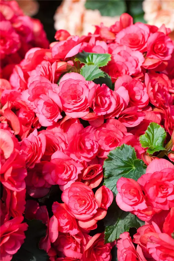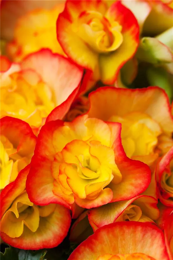 Begonia 'Diverse Deco' Im Garten findet man hierzulande meist Knollen-Begonien. Sie entstanden aus Kreuzungen knollenbildender Arten aus Südamerika. Es gibt sie in den verschiedensten Formen. Großblumig mit einfachen Blüten, kraus oder fransig, zur Hälfte oder ganz gefüllt. Auch hängende Knollen-Begonien erfreuen sich großer Beliebtheit. Sie zieren perfekt Balkon und Terrasse in Blumenampeln. Diese Begonien werden der Pendula-Gruppe zugeordnet. Multiflora-Begonien dagegen erkennen Sie am besten an ihrem kompakten Wuchs und einer vollen Blütenpracht in Gelb, Rot, Rosa oder Weiß. Auch bei diesen Begonien können Sie zwischen ungefüllten oder gefüllten Blüten wählen.