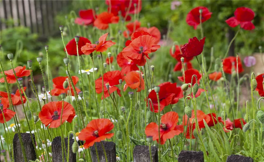 Papaver rhoeas, rot Klatschmohn darf im Garten in keinem Staudenbeet fehlen. Im Naturgarten fügt sich der Klatschmohn zusammen mit anderen Ackerbegleitpflanzen wie Kornblume und Kornrade ein, macht einen natürlichen Eindruck und sorgt für Harmonie im Staudenbeet. Auch für Balkon und Terrasse ist der Klatschmohn geeignet. Da er aber als Ackerwildpflanze eine Wuchshöhe von bis zu 60 Zentimetern erreichen kann, sollte man für Balkon und Terrasse eher auf die neuen Zuchtformen zurückgreifen. Die werden nicht so groß und mittlerweile sind sie auch in den unterschiedlichsten Blütenfarben erhältlich. Ausgesät wird Klatschmohn im März und April direkt ins Freiland. Die Samen vom Klatschmohn sind Lichtkeimer und werden deshalb nur auf die Erde gelegt und leicht angedrückt und nicht mit zusätzlicher Erde bedeckt. Wenn sich der Klatschmohn nach der Blüte selbst aussät, liegen die Samen auch auf der Erde auf und keimen dort. Wenn sich die ersten Jungpflanzen entwickelt haben, kann der Bestand ausgedünnt und die einzelnen Pflanzen mit einem Abstand von 25 Zentimetern gepflanzt werden. Werden die Blütenstände nach der Blüte nicht entfernt, kommt der Klatschmohn im neuen Jahr von selbst wieder.