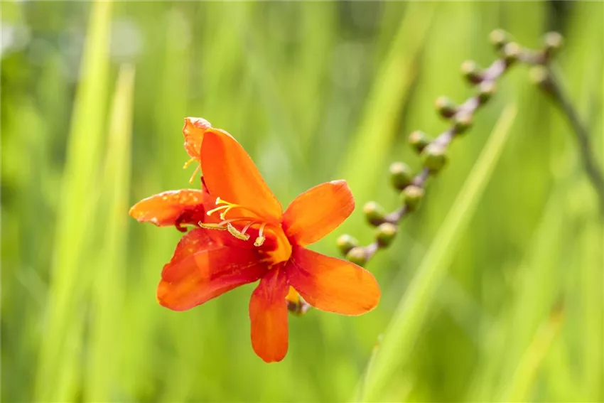 Crocosmia x crocosmiiflora Das richtige Blumenbeet beachtet die Vorliebe des Gartenbesitzers für eine bestimmte Farbe. Warme Rottöne wirken optisch verkürzend, während die kühlen Blautöne ihre Umgebung weitläufiger erscheinen lassen. Für beide gibt es Ergänzungen aus passenden Farbfamilien. Auf ihren Einsatz warten Zwiebel- und Knollenpflanzen wie die zarte Frühlings-Knotenblume, der füllige Hahnenfuß und die traumhafte Amaryllis, auch Exotisches wie die „Sternschnuppe“, ein gladiolenähnliches Schwertliliengewächs. Jetzt noch etwas Immergrünes dazwischen, und das richtige Blumenbeet ist geschaffen. Am besten macht man sich einen Pflanzplan und entscheidet sich dabei auch für die passende Beetumrandung.