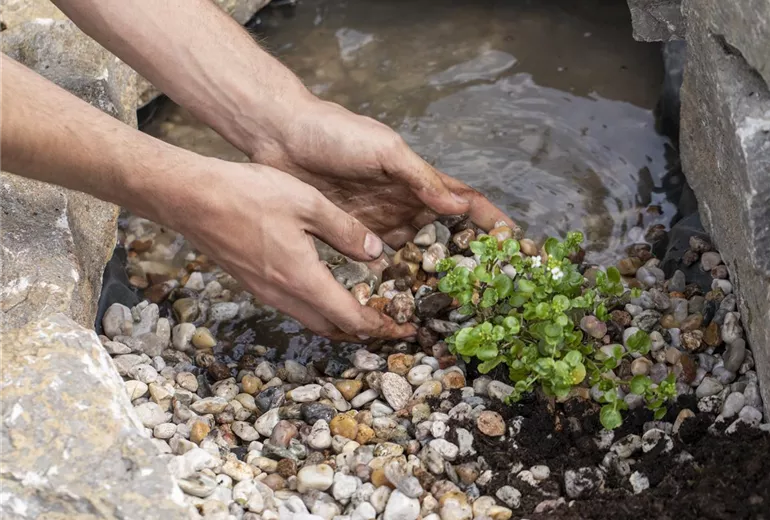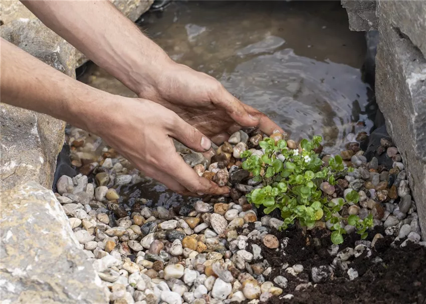 Dann wird es auch schon Zeit für die Kräuter. Im oberen Bereich, der nährstoffärmer und trockener ist, finden Rosmarin, Lavendel, Thymian, Majoran, Salbei oder Bohnenkraut Platz. Auf mittlerer Höhe der Kräuterspirale ist die Erde gleichmäßig feucht, frisch und nährstoffreich. Hier fühlen sich Zitronen-Melisse, Estragon oder Schnittlauch sehr wohl. Im unteren Bereich der Kräuterspirale, wo es sehr nass werden kann und wird, fühlen sich Brunnenkresse, Pfefferminze oder Wassernuss so richtig wohl. Der Übergang zwischen den einzelnen Bereichen ist sehr fließend, deshalb sollte man den Boden genau beobachten und kontrollieren, ob er trocken, mäßig trocken, frisch, feucht oder nass ist. Danach richtet sich, welche Kräuter so gepflanzt werden.