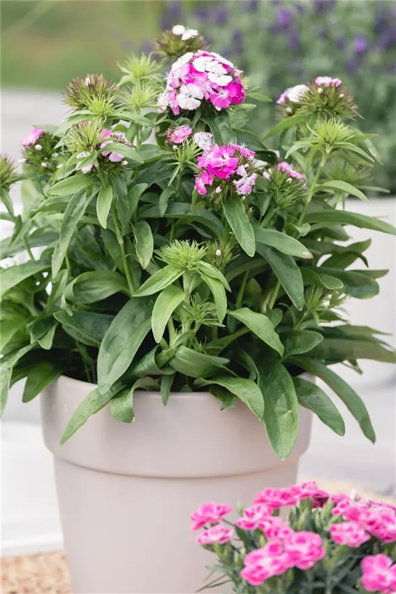 Dianthus barbatus 'Dash' Die Bartnelke blüht erst ein Jahr nachdem sie gepflanzt wurde. Im ersten Jahr verabschiedet sich die Pflanze im Garten mit einer grundständigen Blattrosette in die kalte Jahreszeit. Damit der Frost den Wurzelballen aber nichts anhaben kann, sollte die Pflanze mit Laub und Reisig abgedeckt werden. Sollte die Bartnelke den Frost nicht überleben (sie hält sich leider nicht immer an den zweijährigen Lebensplan) hat sie mit Selbstaussaat immerhin für jede Menge Nachwuchs gesorgt.
