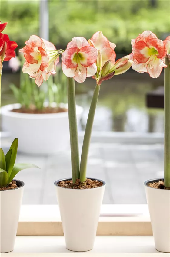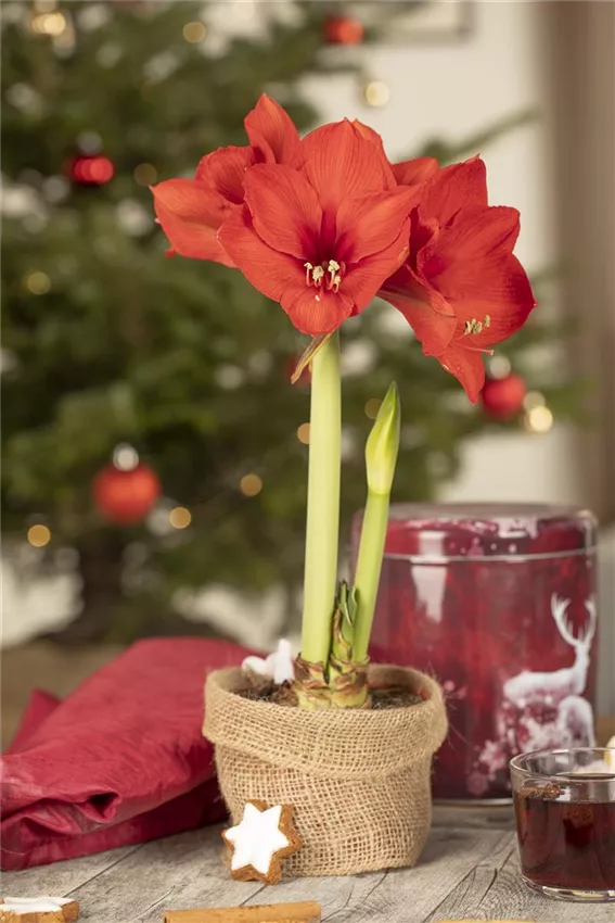 Hippeastrum Um Blüten bilden zu können, benötigen Blumenzwiebeln einen Kälteimpuls. Am einfachsten ist es, vorgetriebene Blumenzwiebeln zu kaufen. Diese haben eine Kälteperiode mitgemacht und können deshalb direkt eingepflanzt werden. Im warmen Wohnzimmer kommen sie dann schon nach etwa 3 bis 6 Wochen zur Blüte. Für zwei Wochen haben Sie den Frühling in Ihren vier Wänden sicher. Sie können die Kälteperiode aber auch nachstellen, indem Sie die Zwiebeln 3 Monate lang eingepflanzt in einem dunklen Raum bei circa 9 °C Raumtemperatur aufbewahren. Sobald die ersten Pflanzen sichtbar werden, können Sie in warme Räume geholt werden, wo sie aufblühen. Wollen Sie die Blüte zu Weihnachten genießen, pflanzen Sie die Blumenzwiebeln am besten im November.