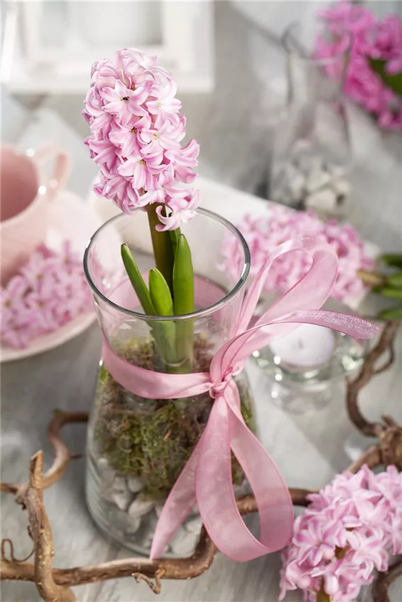 Hyacinthus Amaryllis im Topf können Sie leicht zum Blühen bringen. Sorgen Sie für eine ausreichende Drainage und pflanzen Sie die Zwiebel so, dass sie ein Drittel über den Boden herausragt. Gießen Sie zu Beginn nur wenig und möglichst nicht direkt auf die Zwiebel. Sobald sie austreibt, braucht die Amaryllis mehr Wasser. Ihre Blüte hält die Blumenzwiebel länger, wenn sie kalt steht. Als Trockenzwiebel brauchen Amaryllis und Herbstzeitlose kein Wasser und keine Erde. Sie haben so viel Energie in ihrer Zwiebel, dass sie einfach so aufblühen. Legen Sie sie auf eine Schale mit Moos oder Steinen und sorgen Sie so für einen Überraschungseffekt auf der Fensterbank! Auch im Wasserglas kann man Amaryllis ziehen. Sehr bekannt sind hierfür auch Hyazinthen. Diese legen Sie in ein so genanntes Hyazinthenglas. Dessen besondere Form sorgt dafür, dass die Zwiebel knapp über dem Wasser aufliegt, aber nicht darin versinkt. So können die Wurzeln dem Wasser entgegenwachsen und wenn sich die Blütenknospe vollständig entwickelt hat, löst die Hyazinthe im Wohnzimmer Frühlingsgefühle aus!