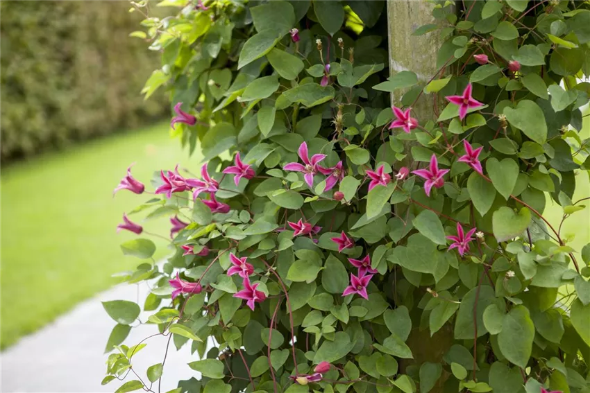 Clematis texensis 'Princess Diana' Schon beim Einpflanzen sollte die Clematis eine Rankhilfe bekommen, damit sie nach oben wachsen kann. Dort fühlen sich die Ranken der Kletterpflanze nämlich am wohlsten. Wer eine größere Fläche mit der Clematis begrünen will, der kann das Wachstum der Pflanze selbst steuern, indem dementsprechende Rankgitter befestigt werden, die die Kletterpflanze in eine bestimmte Richtung leiten. Die Clematis wird so wachsen, dass sie sich am besten festhalten kann. Eine Clematis eignet sich aber nicht nur zum Begrünen von Flächen, sondern auch für Säulen, Torbögen und alle anderen erdenklichen Formen. Wichtig ist immer nur die Führung der Pflanze. Wenn sie die bekommt, wird sie so wachsen, wie es gewünscht ist. Dafür müssen die Triebe einfach geführt werden, bis sie sich festgehalten haben. Der optimale Pflanzzeitpunkt für die Clematis ist zwar der Spätsommer, aber Containerpflanzen können auch im Frühjahr oder Herbst gepflanzt werden. Wichtig ist nur, dass die Kletterpflanze genügend Zeit bekommt, um gut anzuwachsen und Kraft für den Winter und das neue Gartenjahr zu tanken.