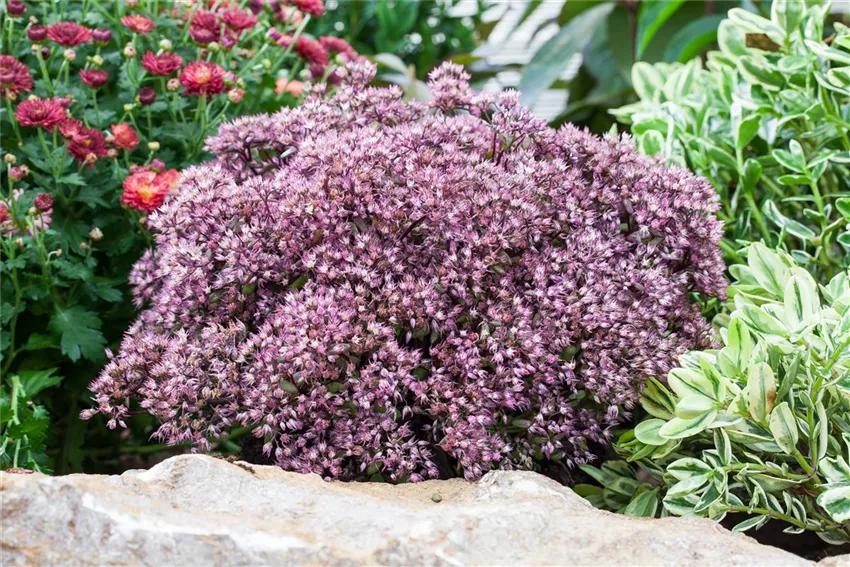 Sedum Dabei machen sie die eleganteste Figur, wenn Sie mit Stein-Findlingen kombiniert in großen Gruppen gepflanzt werden und mit dekorativen Süßgräsern wie dem Blauschwingel oder auch Lampenputzergras ergänzt werden.