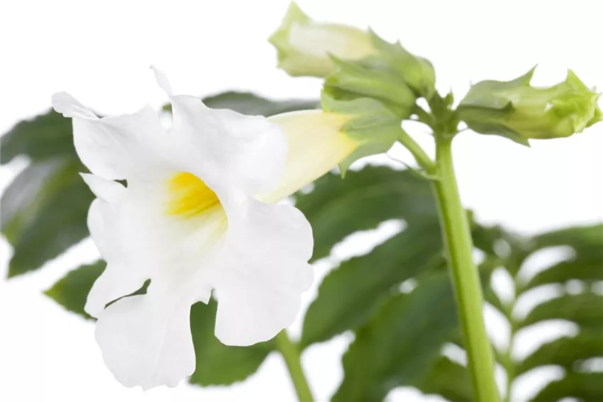 Incarvillea delavayi Die Freilandgloxinie wächst als Staude bis zu 60 Zentimeter in die Höhe und Breite. Ihre dunkelgrünen Blätter sind gefiedert und am Rand gezähnt. Dadurch ähneln sie einem Farn. Diesem Umstand verdankt sie ihren Beinamen „blühender Farn“. Die markanten Blüten erscheinen zwischen Juni und Juli in Weiß und tiefem Rosa. Sie erreichen einen Durchmesser von bis zu 8 Zentimetern und weisen einen gelben Schlund auf. In waagerechtem Wuchs stehen die Blüten von kräftigen, leicht gebogenen Stielen ab. Die Speicherwurzeln der Pflanze sind knollig und ähneln dicken Fingern, so wie man es von der Dahlie kennt. Alles an dieser prachtvollen Staude ist imposant!
