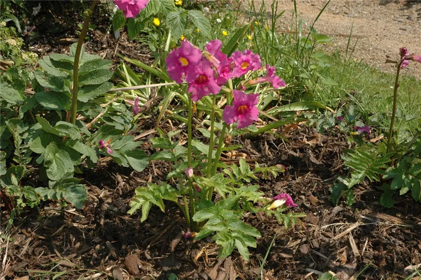 Incarvillea delavayi Die Familienzugehörigkeit der Freilandgloxinie erkennt man an ihren Blüten: Trompetenartig strecken sie sich nach vorn. Das Trompetenbaumgewächs stammt aus Westchina, wo es im Freiland auf Anhöhen wächst. Die Freilandgloxinie ist auch unter ihrem botanischen Namen geläufig, Incarvillea delavayi. Der beweist, dass die Namensgleichheit mit der Gloxinie nur Zufall ist. Obwohl sie zusätzlich noch als Gartengloxinie oder winterharte Gloxinie bekannt ist, ist die Freilandgloxinie mit der als Zimmerpflanze gehaltenen Gloxinie (Sinningia speciosa) nicht verwandt. Sie gehören unterschiedlichen Gattungen an und müssen auch unterschiedlich kultiviert werden.