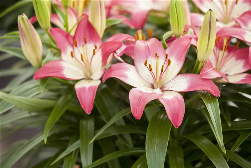 Lilium, rosa Schon die alten Griechen und Römer wussten die Lilie im Garten zu schätzen. Das macht sie zu einer der ältesten Gartenpflanzen, die bis heute kultiviert werden. Dank ihrer eleganten und auffällig schönen Blüte hat sie bis zum heutigen Tag nichts an Popularität verloren. Trotz ihrer charakteristischen Form sind Lilienblüten sehr vielseitig. Aufrecht oder seitlich in Trauben, Rispen oder Dolden – die Blüten stehen ganz unterschiedlich. Auch ihre Form gibt es in den verschiedensten Variationen von becher- und schüsselförmig zu Glocken-, Trompeten- oder Trichterform. Lilien sind ein wahrer Blickfang.