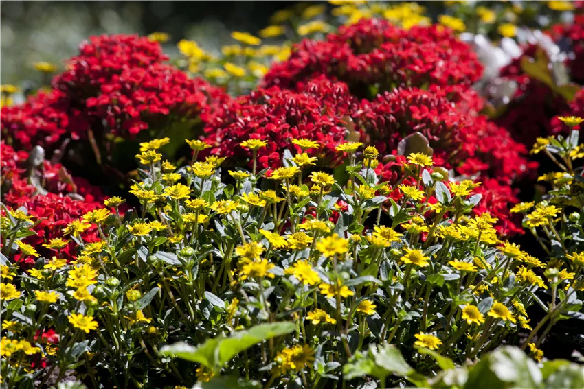 Kalanchoe blossfeldiana mit Sanvitalia procumbens Eine Kalanchoe pflanzen ist nicht schwer, hat die Pflanze doch kaum Ansprüche. Ein heller und sonniger Standort ist wichtig, damit sie sich gesund und kräftig entwickeln kann. Im Haus benötigt die Pflanze ein lockeres und eher nährstoffarmes Substrat ist für die sukkulente Pflanze perfekt geeignet. Wichtig ist, dass Staunässe gar nicht erst entsteht. Deshalb kann man beim Kalanchoe pflanzen vorab eine Schicht Blähton oder Kies in das neue Pflanzgefäß geben. Das dient als Drainage und verhindert, dass das Gießwasser im Wurzelbereich der Pflanze stockt und zu Fäulnis führt. Durch ihre dickfleischigen sukkulenten Blätter ist die Kalanchoe ohnehin nicht sehr durstig und speichert das Wasser in ihren Pflanzenteilen ab. Wichtig ist auch, dass überschüssiges Gießwasser abfließen kann. Ein Pflanzgefäß mit Abzugsloch ist daher am besten geeignet. Das kann dann in eine Auffangschale gestellt und das stehende Wasser nach dem Gießen weggekippt werden. Wer seine Kalanchoe jedes Jahr umtopft, kann ein gesundes und prächtiges Wachstum beobachten.