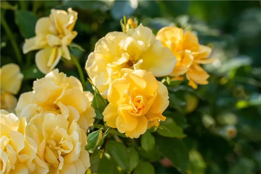 Strauchrose, gelb Beim Rosen einpflanzen kommt es vor allem auf die richtige Pflanztiefe an. Die ist entscheidend dafür, wie sich die Pflanzen entwickeln werden. Auch der Durchmesser des Pflanzloches ist wichtig, da Rosen sehr kräftige und lange Wurzeln entwickeln, die ordentlich Platz brauchen. Deshalb sollte das Pflanzloch immer mindestens doppelt so breit und genauso tief sein, wie der Wurzelballen. Rosen haben eine Veredelungsstelle. Die sollte beim Rosen einpflanzen etwa 5 Zentimeter unter der Erdoberfläche liegen. Das schützt sie besonders im Winter vor Sonne und Frost. Frischer Kompost im Pflanzloch gibt der Rose nach dem Einpflanzen noch ausreichend Nährstoffe für einen guten Start mit. Dann kann die Erde wieder aufgefüllt und rundherum mit dem Fuß leicht festgetreten werden. Dadurch schließen sich Hohlräume in der Erde und die Wurzeln bekommen einen guten Bodenkontakt. Und auch danach heißt es: Wasser marsch! Denn nach dem Rosen einpflanzen wollen die Majestäten auch ausreichend Wasser haben. Im letzten Schritt werden die Rosen noch angehäufelt. Dafür gibt man eine rund 15 Zentimeter hohe Erdschicht rund um den Stamm, um die Rose vor Frost zu schützen. Wenn der Frühling da ist und keine Fröste mehr zu erwarten sind, kann die Erdschicht begradigt werden.
