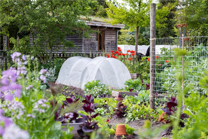 Gemüsebeet mit Pflanztunnel Mit einem Selbstversorgergarten kann man sich unabhängig machen, saisonales Obst und Gemüse anbauen und sich davon ernähren.