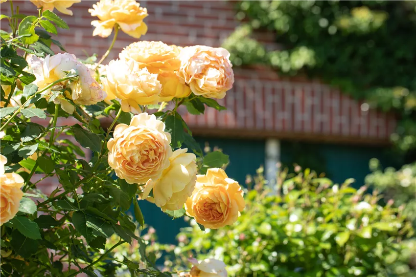 Englische Rosen, apricot Wer das Rosen zurückschneiden im Frühjahr vornehmen möchte, der sollte drei goldene Regeln beachten, damit die Pflanzen auch von dem Rückschnitt profitieren. Grundsätzlich gilt bei allen Rosenarten: man schneidet immer oberhalb einer nach außen zeigender Knospe oder einem Augenpaar. Außerdem sollte man darauf achten, dass die Schnittfläche nicht gerade, sondern schräg angelegt ist. Das sorgt dafür, dass Wasser besser abfließen kann und sich nicht an der Schnittkante sammelt. Anders als beim Pflanzschnitt, geht man im Frühjahr radikaler vor. Jetzt werden alle Teile der Rose abgeschnitten, die das Wachstum der Pflanze beeinträchtigen. Das betrifft vor allem abgestorbene Teile, die eventuell den Winter nicht überlebt haben. Das tote Holz entfernt man entweder direkt an der Basis oder an der Stelle, an der sich wieder grünes und gesundes Holz abzeichnet. Auch kranke oder verkümmerte Triebe werden entfernt und mit einer Schere abgeschnitten. Wichtig ist auch, beim Rosen zurückschneiden im Frühjahr Triebe abzuschneiden, die zu dicht wachsen und der Pflanze keine Luft geben. Beim Auslichten werden schräg wachsende Triebe ebenfalls mit der Gartenschere entfernt.