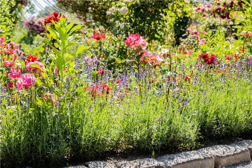Rosenbeet mit Lavendel Weil man bei der Gartengestaltung mit Beetrosen nicht nur auf die Blühschönheiten setzen kann, kann man die Pflanzen mit den passenden Nachbarn kombinieren. Je nach Standort kann man dann für die richtigen Akzente sorgen. Da Beetrosen einen buschigen Wuchs haben, muss man sich um die Unterpflanzung eigentlich keine Gedanken machen. Denn auch den Bereich am Boden füllen die Schönheiten verlässlich aus. Aber zwischen den einzelnen Pflanzen kann ein bisschen Platz für andere Schönheiten bleiben. Besonders beliebt in Kombination mit Rosen: Lavendel. Die duftende Staude sorgt nicht nur für ein harmonisches Bild, sie zieht auch Bienen und andere Insekten an, die dem Garten guttun. Oder wie wäre es mit frischen Kräutern? Auch die machen neben den Beetrosen eine gute Figur, wenn sie einen sonnigen Standort mögen. Und dann gibt es da noch den absoluten Klassiker, der bei der Gartengestaltung mit Beetrosen neben den Schönheiten nicht fehlen darf: Buchsbaum. Das Gehölz kann als Beeteinfassung, im Hintergrund oder als Solitär in der Nachbarschaft gepflanzt werden und passt perfekt zu den bunten Blüten der Rosen.