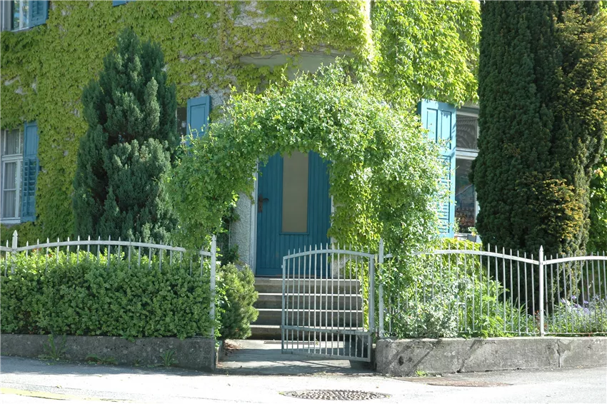 Hauseingang mit Kletterpflanzen Bei der Wahl eines Gartenzauns sollte auch immer der Stil des Hauses sowie die Gestaltung des Grundstücks und Gartens berücksichtigt werden, damit alles miteinander harmoniert. Zu den klassischen Gartenzäunen, die vor allem zu einem Bauerngarten passen, zählen der Lattenzaun, Staketenzaun, Jägerzaun sowie der Flechtzaun aus Weidenruten, die alle aus Holz bestehen und eher locker und durchlässig wirken. Außerdem lassen sich diese Zaunarten sehr gut begrünen, da sowohl die Zwischenräume als auch die raue Oberfläche des Holzes für Kletterpflanzen optimal sind. Aber auch für vierbeinige Besucher, wie Igel sind diese Gartenzäune praktisch, da sie im unteren Bereich durch die Lücken schlüpfen können. In der klassischen Ausführung werden diese Gartenzäune auch nicht gestrichen, was das natürliche Flair unterstreicht.