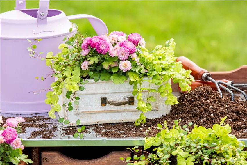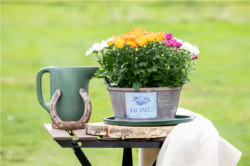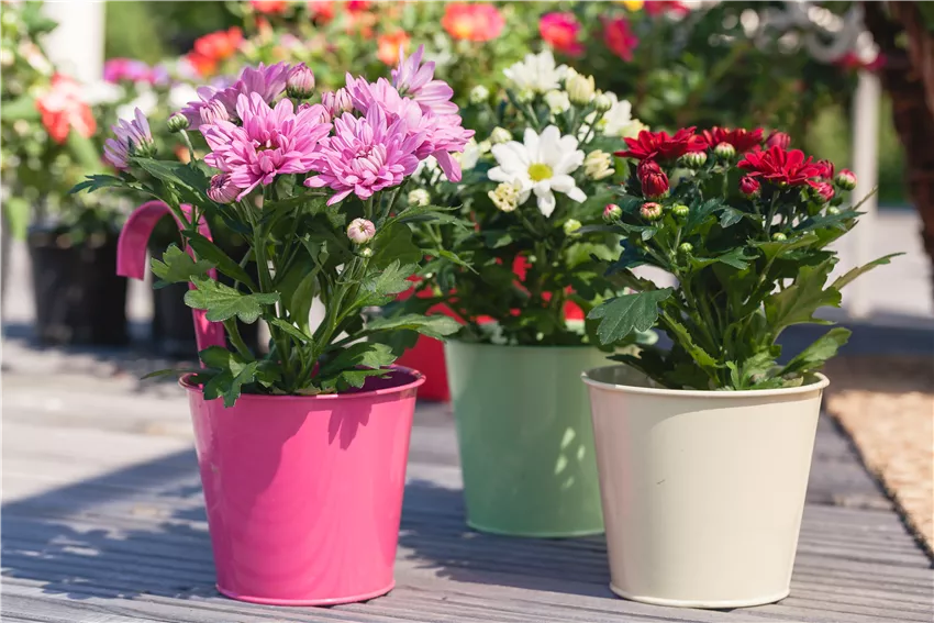 Pflanzgefäß im Ambiente Damit sich die Blühwunder im Garten und auf dem Balkon auch so richtig wohlfühlen können, kommt es auf den richtigen Standort und die optimalen Bedingungen an. Die zu erfüllen ist aber nicht schwer, denn Chrysanthemen sind robust, pflegeleicht und nicht besonders anspruchsvoll. An einem sonnigen Standort fühlen sich die Schönheiten besonders wohl und werden dort viele bunte Blüten ausbilden. Ein nährstoffreicher Boden ist entscheidend für ein gesundes und kräftiges Wachstum. Durchlässig und locker sollte der Boden aber auch sein, denn mit zu feuchter Erde kommen Chrysanthemen nicht gut zurecht. Für eine gute Drainage kann Kies oder Sand in den Gartenboden gemischt werden. Im Kübel ist einfache Blumenerde die beste Wahl. Die enthaltenen Düngeanteile sorgen auch dafür, dass die Pflanzen immer mit ausreichend Nährstoffen versorgt sind. Und wer Verblühtes immer wieder aus der Pflanze putzt, der kann die ohnehin lange Blütezeit noch ein kleines bisschen in die Länge ziehen.