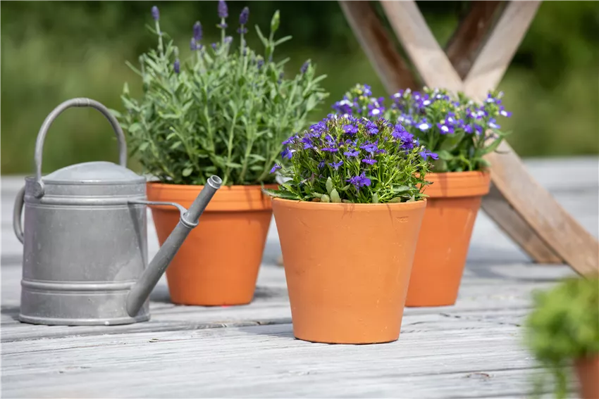 Lobelia 'Laguna® Compact' Pflanzgefäße aus Kunststoff sind günstig in der Anschaffung und sehr leicht zu transportieren, wenn es zum Beispiel darum geht, große Pflanzen ins Winterquartier zu bringen. Allerdings sind Pflanzgefäße aus Kunststoff nicht immer formschön. Hartplastik ist nicht UV-beständig und das terrakottafarbene Pflanzgefäß wird rasch grau. Zwar ist es auch von Vorteil, dass Pflanzgefäße aus Kunststoff sehr dicht sind, doch die Wurzeln können in ihnen nicht so gut atmen wie zum Beispiel in Terrakotta.