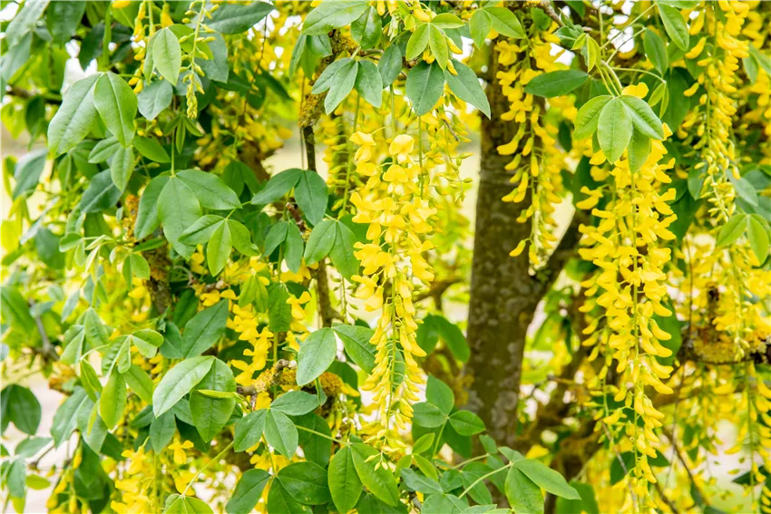 Laburnum anagyroides 'Fastigiata' Besonders effektiv, wenn es darum geht, Laubgehölze vor Schädlingen zu schützen, ist die eigene Abwehr der Pflanzen. Dafür ist es wichtig, dass sie gesund sind. Die eigene Gesundheit kann auch bei Pflanzen, wie bei uns Menschen, viel gegen Feinde ausrichten. Haben wir ein gesundes Immunsystem, sind wir resistenter gegen Keime und Bakterien. So ist es auch mit Pflanzen. Haben Laubgehölze Risse oder Verletzungen in der Rinde oder den Trieben, können sich Krankheiten und Schädlinge schneller einnisten und ausbreiten. Sind die Pflanzen gesund, können sich die Laubgehölze vor Schädlingen schützen – und das oft ganz von alleine. Deshalb ist es wichtig, seine Pflanzen genau zu beobachten. Zeigen sich wunde Stellen oder andere Veränderungen, sollte man handeln, um Schlimmeres zu verhindern. Schon beim Kauf sollte man auf gesunde Pflanzen achten. In der Pflege kommt es auf Gießen und Düngen an. Und zwar genau so, wie die Pflanze es mag. Wenn man Laubgehölze vor Schädlingen schützen möchte, sollte man ihnen genau das geben, was sie wollen. So sind die Pflanzen im Garten stark genug, einen leichten Befall durch neue Nährstoffe und eigene Abwehrkräfte auch schnell selbst wieder in den Griff zu bekommen.