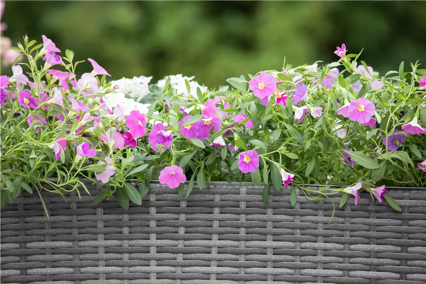 Calibrachoa, rosa In Innenstädten ist es üblich, dass sich Wohnhaus an Wohnhaus reiht und auch die Balkone der Eigentümer und Mieter von allen Seiten einsehbar sind. Der Wunsch nach Privatsphäre ist verständlich und gilt nicht nur für Hausbesitzer und den eigenen Garten. Auch für den Balkon werden daher Sichtschutzwände und andere Hilfsmittel angeboten, um Balkone uneinsehbar zu machen. Kletterpflanzen können als ganzjährige Balkonpflanzen ebenfalls eingesetzt werden, um einen Sichtschutz zu gewährleisten. Beim Anpflanzen von Kletterpflanzen sollte darauf geachtet werden, dass nur Teile des Balkons bewachsen werden. Außerdem sollten Mieter die Regularien im Mietvertrag beachten, die in manchen Fällen ein großflächiges Bewachsen mit Kletterpflanzen untersagen. Stört beispielsweise der ungeschützte Seitenblick, können ein oder zwei Blumenkästen oder ein Blumenkübel mit Rankenpflanzen bestückt werden.