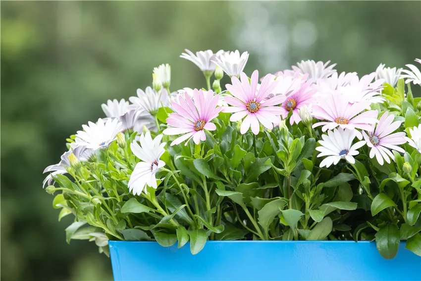 Osteospermum ecklonis, weiß Jeder Balkon ist unterschiedlich und nicht immer ist es notwendig oder gewünscht, mit ganzjährigen Balkonpflanzen einen Sichtschutz herzustellen. Wer Freude am Trend „Urban Gardening“ hat, kann daher auch Küchenkräuter als ganzjährige Balkonpflanzen auf dem Balkon wählen. Kräuter als ganzjährige Balkonpflanzen haben zwei entscheidende Vorteile. Zum einen ist es gesund und lecker, frische Gewürzpflanzen wie Rosmarin, Basilikum oder Salbei auf dem Balkon anzupflanzen und frisch zur Zubereitung von Speisen zu verwenden. Gleichzeitig wirken die Aromen mancher Kräuter natürlich gegen Schädlinge auf dem Balkon. Thymian oder Rosmarin vertreiben beispielsweise Schnecken vom Balkon. Dies wird vor allem dann geschätzt, wenn auf dem Balkon ebenfalls Salat oder Gemüse angebaut werden. Lavendel ist bekannt, Blattläuse zu vertreiben, die sich in der Folge auch nicht an Blüh- oder Staudenpflanzen heften.
