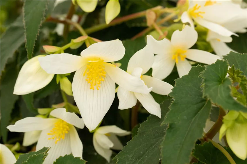 Begonia boliviensis 'Shine Bright™ White' Beim Begonien pflanzen hat man die Wahl, ob bereits vorgezogene Pflanzen aus dem Gartencenter oder der Gärtnerei gepflanzt werden sollen, oder ob man selbst kleine Begonien vorziehen möchte. Ist letzteres der Fall, dann sollte man damit am besten ab Februar anfangen. Knollenbegonien können dann im Haus vorgezogen werden und dürfen nach den Eisheiligen zu den anderen Pflanzen auf den Balkon oder in den Garten. Was den Pflanzabstand betrifft, so sollte man den einzelnen Pflanzen ausreichend Platz zur Verfügung stellen. Mindestens 20 Zentimeter Abstand sind ideal, damit sich die Wurzeln ausbreiten können und die Blühpflanzen groß und kräftig wachsen. Stehen die Begonien zu dicht, kann das zu Fäulnis in den Pflanzen führen. Wer Blatt-Begonie im Garten oder auf dem Balkon pflanzen will, der kann diese ganz einfach aussäen. Auch diese Begonien sollte man vorziehen und nach den Eisheiligen ins Freiland oder auf den Balkon setzen. Wichtig bei der Aussaat: Lichtkeimer wie Blatt-Begonien benötigen keine dicke Erdschicht über den Samen. Ein bisschen Erde sieben reicht schon, um sie vor dem Wegwehen durch Wind zu schützen.