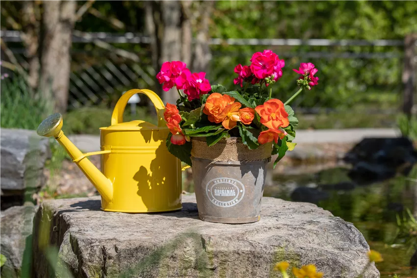Bepflanzter Übertopf im Gartenambiente Nach dem Begonien pflanzen kommt es auf die richtige Pflege an. Die fällt zwar gering aus, ist aber entscheidend für ein gesundes und kräftiges Wachstum. Während der Saison im Sommer sollte man regelmäßig Nährstoffe zuführen. Trotzdem benötigen sie nicht so viele Nährstoffe, wie andere Balkonpflanzen. Alle 14 Tage ist flüssiger Dünger die beste Wahl, um die Blüte der Pflanzen weiter anzuregen. Dieser kann einfach unter das Gießwasser gemischt und verabreicht werden. Und wer regelmäßig Verblühtes an den Pflanzen entfernt, kann sich über eine noch längere Blütezeit freuen. Damit die Pflanzen buschiger und kompakter wachsen, können die jungen Triebspitzen abgeschnitten werden. Obwohl das die Blüte etwas verzögert, wird der Wuchs der Pflanze dadurch dichter und noch malerischer. Begonien pflanzen bedeutet auch, die Pflanzen im Winter in ein frostfreies Quartier umzusiedeln. Dafür wird im Herbst einfach das Grün der Pflanzen entfernt und die Knollen kühl und dunkel gelagert. Ein Keller eignet sich dafür besonders gut. Im nächsten Jahr können die Knollen dann wieder vorgezogen werden und dürfen ab Mai an die frische Luft. Einer üppigen Blüte steht dann nichts mehr im Wege.