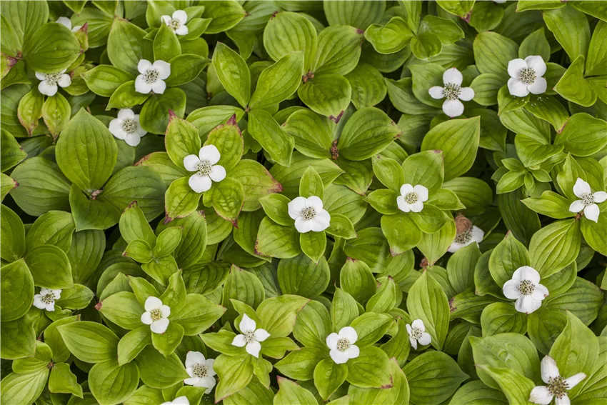 Cornus canadensis Wer die Qual hat, der hat die Wahl. So geht es einem auch, wenn es darum geht, die passenden Bodendecker für den eigenen Garten auszusuchen. Es gibt so viele Arten und Sorten und eine ist schöner als die andere! Angefangen mit der Polsterglockenblume. Sie liebt die Sonne und blüht von Juni bis August. Die sommergrünen Pflanzen fühlen sich in Gruppen von 12 Pflanzen pro Quadratmeter am wohlsten und werden lediglich 10 Zentimeter hoch. Beinwell gehört ebenfalls zu den beliebten Bodendeckern. Die Pflanze ist für Sonne und Halbschatten geeignet und erreicht eine Größe von bis zu 60 Zentimetern. Zur gleichen Zeit wie bei der Polsterglockenblume zeigen sich kleine Blüten und wer vier bis sechs Pflanzen pro Quadratmeter setzt, kann sich schon bald über einen grünen Teppich mit hübschen Blüten freuen. Der Teppichhartriegel bevorzugt einen Standort im Halbschatten und eignet sich daher gut als Unterpflanzung von Bäumen oder Sträuchern. Er wird bis zu 20 Zentimeter hoch und blüht im Juni. Pro Quadratmeter sollte man ca. 15 Pflanzen setzen.