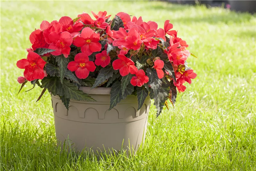 Bepflanzter Übertopf im Gartenambiente Begonien gehören zu den absoluten Allstars unter den Beet- und Balkonpflanzen. Kein Wunder, denn sie überzeugen mit ihrer Pflegeleichtigkeit und ihren Blüten. Die zeigen sich besonders lange an den Pflanzen und verschönern damit jedes Beet, jeden Kübel und auf jeden Fall den ein oder anderen Balkonkasten. Wer da noch nein sagen kann, ist selbst schuld!