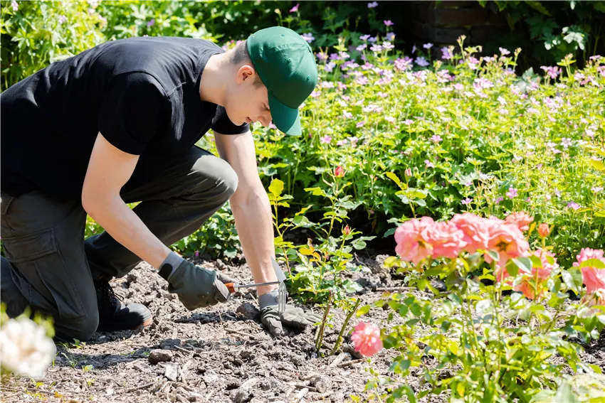 Mann bei der Gartenarbeit Neben Standort und Boden kommt es auch auf den richtigen Zeitpunkt an, wenn man Beetrosen pflanzen möchte. Der ist vor allem im Frühjahr oder im Herbst, wobei sich der Herbst als klassische Pflanzzeit für Rosen entwickelt hat. Dann sind die Wurzeln nämlich bis zum nächsten Sommer gut auf die Trockenheit vorbereitet und auch Frost kann ihnen mit dem passenden Schutz im ersten Winter nur wenig anhaben. Vor dem Beetrosen pflanzen sollte man den Wurzelballen ausreichend Wässern. Dafür holt man ihn aus dem Plastiktopf und setzt ihn in einen Eimer mit Wasser. Steigen keine Bläschen mehr auf, haben sich die Wurzeln ausreichend mit Wasser vollgesogen. Beim Einpflanzen sollte man darauf achten, dass das Pflanzloch ausreichend groß ist, die Veredelungsstelle der Rosen aber nicht unter der Erde verschwindet, sondern darüber platziert wird. Wer im Frühjahr pflanzt, kann organischen Dünger in die Erde einarbeiten. Gedüngt wird bei der Pflanzung im Herbst nicht. Denn dann würden die Rosen frische neue Triebe ausbilden, die im Winter erfrieren könnten.