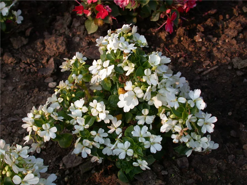 Impatiens walleriana, weiß Beim Fleißiges Lieschen pflanzen kommt es nicht nur auf den passenden Standort, sondern auch auf das richtige Substrat an. Das sollte im besten Fall locker, durchlässig und nur mäßig nährstoffreich sein. Wer das Fleißiges Lieschen im Garten einpflanzen möchte, kann vor der Pflanzung ein bisschen Bodenarbeit durchführen. Dafür lassen sich schwere Böden mit Kies oder Sand auflockern und nährstoffarme Böden können mit Hornspäne oder reifem Kompost aufgefrischt werden. Im Kübel ist Fleißiges Lieschen pflanzen noch einfacher, denn hier kann man auf Balkonblumenerde zurückgreifen. Da die Stauden einen schwach sauren bis sauren Boden bevorzugen, kann Moorbeetpflanzenerde wie für Rhododendren oder Heide mit herkömmlicher Pflanzerde vermischt werden. Vor dem Fleißiges Lieschen pflanzen im Kübel sollte man kontrollieren, ob überschüssiges Gieß- oder Regenwasser durch ein Abzugsloch abfließen kann. Wer sich mit der ausschwemmenden Erde nicht den Boden schmutzig machen möchte, der kann eine Tonscherbe über das Lock legen. So kann das Wasser abfließen, die Erde bleibt im Kübel und es entsteht keine Staunässe. Die mag nämlich auch das Fleißige Lieschen nicht.