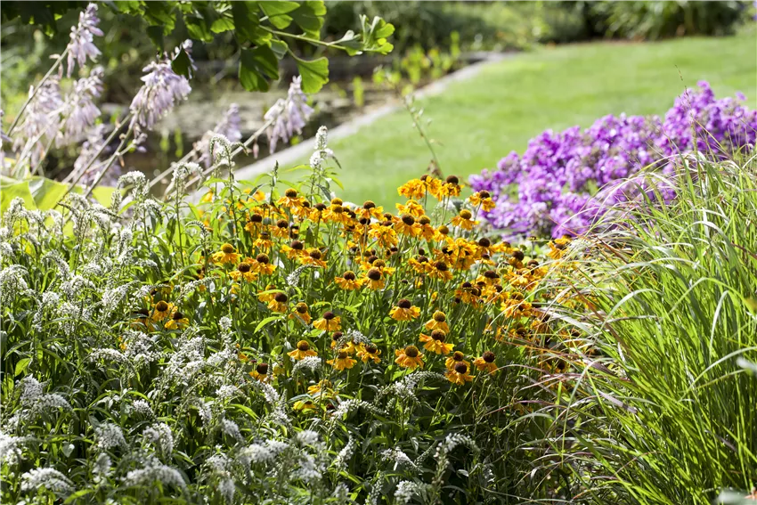 Beet mit Helenium Ein Garten, in dem es fast das ganze Jahr hindurch blüht, ist wohl der Traum eines jeden Gärtners. Wer bei der Gartengestaltung mit Stauden besonders klug vorgeht, kann sich diesen Traum erfüllen. Denn die verschiedenen Staudenarten mit ihren unterschiedlichen Blütezeiten bringen das ganze Jahr über Farbe in den Garten. Besonders schön wirken die mehrjährigen Stauden, wenn sie mit einjährigen Sommer- und Herbstblumen wie beispielsweise Ringelblumen oder Löwenmäulchen zusammen das Staudenbeet zieren. Im Frühling können dann Frühblüher wie Krokusse und Schneeglöckchen mit ihrer reichen Blütenpracht das Beet ergänzen. Auch Ziergräser eignen sich perfekt als attraktive Pflanzpartner für die dekorative Gartengestaltung mit Stauden. Wichtig ist bei der Kombination mit Pflanzpartnern jeder Art, dass die Pflanzpartner ähnliche Ansprüche an den Standort haben wie die Stauden selbst, damit sich alle Pflanzen auf dem Staudenbeet wohlfühlen. Denn nur so entwickeln sie genügend Widerstandskräfte, um auch gegen Schädlinge und Krankheitserreger gefeit zu sein. Dann ist auch der jeweilige Pflegeaufwand wesentlich geringer, als wenn jede Pflanze desselben Beetes andere Ansprüche an ihren Gärtner stellt.