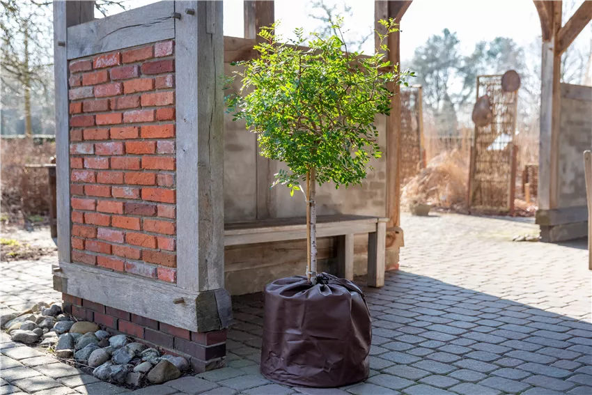 Überwinterung - Thermo Topfschutz Schutz ist im Winter besonders wichtig, daher sollte man beim Garten winterfest machen vor allem darauf wert legen. Denn es gibt Pflanzen, die brauchen ein bisschen Unterstützung, um gut durch die kalte Jahreszeit zu kommen und damit ihnen Schnee und Eis nichts ausmacht. Dazu gehört ein guter Winterschutz, der vor allem bei empfindlichen Kübelpflanzen wichtig ist. Hat man kein frostfreies Winterquartier oder sind die Kübel zu groß zum Einlagern, kann man mit ein paar Mitteln für einen guten Schutz sorgen. So eignet sich eine Kokosmatte auf der Erde gut als Schutz vor Frost und Eis, gießen kann man durch die Matte trotzdem noch. Auch ein Stück Jute um den Topf kann für zusätzliche Wärme an den Wurzeln sorgen und wer kann, sollte die Pflanzkübel auf eine Styroporplatte stellen, damit die Kälte vom Boden nicht zu sehr nach oben zieht. An den Blättern kann ein dünner Stoff locker herumgewickelt für Schutz sorgen. Wichtig ist aber, dass an wärmeren Wintertagen gelüftet wird, damit die Pflanzen nicht anfangen zu schwitzen und das Schwitzwasser später gefriert und Frostschäden anrichtet. Im Frühjahr, wenn keine starken Minusgrade mehr zu erwarten sind, kann der Winterschutz dann wieder entfernt werden.