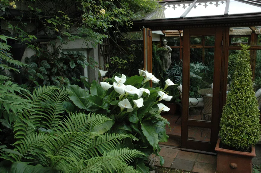 Calla vor Wintergarten Wer das Glück hat, Herr oder Frau über einen eigenen Wintergarten zu sein, der hat den idealen Platz, an dem seine Pflanzen überwintern können. Ein sogenannter Kaltwintergarten, der ausreichend Sonnenlicht hereinlässt und eine gute Luftzirkulation ermöglicht, ist zum Überwintern von Pflanzen viel besser geeignet als ein muffiger, dunkler Keller. Wenn Pflanzen überwintern, benötigen sie Temperaturen um die 5°C und 10°C. Die Temperaturen sollten also gemessen und notfalls reguliert werden, damit es weder zu kalt noch zu warm wird. Auf jeden Fall sollte das Winterquartier frostfrei sein. Da die Pflanzen im Wintergarten oft nahe beisammenstehen, kann es besonders schnell zur Ausbreitung von Pilzerkrankungen oder auch Schädlingen kommen, weshalb auch hier regelmäßig sorgfältig kontrolliert werden muss.