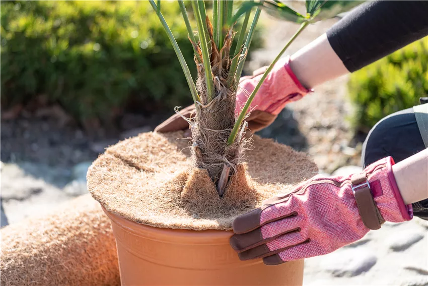 Überwinterung - Frau wickelt Kokosscheibe um eine Pflanze In vielen Lagen kann es im Winter sehr wechselhaft sein. Bei der Gartenarbeit im Winter sollte man daher immer die Temperaturen im Auge behalten und die Pflanzen beobachten. Vor allem Pflanzen mit einem Winterschutz müssen besonders beachtet werden. Denn bei der Gartenarbeit im Winter kommt es vor allem darauf an, sicherzustellen, dass der Winterschutz auch sinnvoll ist. Vor allem exotische und nicht heimische Pflanzen brauchen einen Schutz aus Vlies oder Kokosmatten, damit sie Schnee und Eis unbeschadet überstehen. Nun kann es aber passieren, dass die Temperaturen nach ein paar Tagen Frost in den zweistelligen Bereich klettern und die Pflanzen dadurch verwirrt sind. Wir auch, das ist klar, aber während wir einen Schal oder eine Mütze ausziehen können, wenn es zu warm wird, haben die Pflanzen unter dem Winterschutz keine Möglichkeit, sich Luft zu machen. Daher sollte man den Winterschutz an warmen Wintertagen lüften, damit die Pflanzen keinen Schaden nehmen. Bei der Gartenarbeit im Winter sollte man also den Winterschutz zeitweise entfernen, wenn die Temperaturen wärmer sind. Denn die Pflanzen denken durch die Wärme, dass es Frühjahr ist und treiben aus. Das kann gefährlich werden, wenn es dann wieder friert und die frischen Triebe erfrieren. Um das zu vermeiden kann man Vlies und Co. ab und zu entfernen und wieder neu aufsetzen, wenn die Temperaturen wieder fallen.